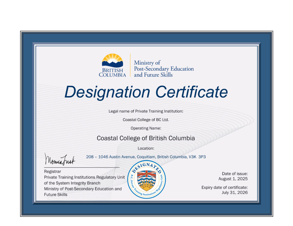Designated B.C. Private Training Institutions Regulatory Unit & Shield Design mark is a certification mark owned by the Government of British Columbia and used under licence.